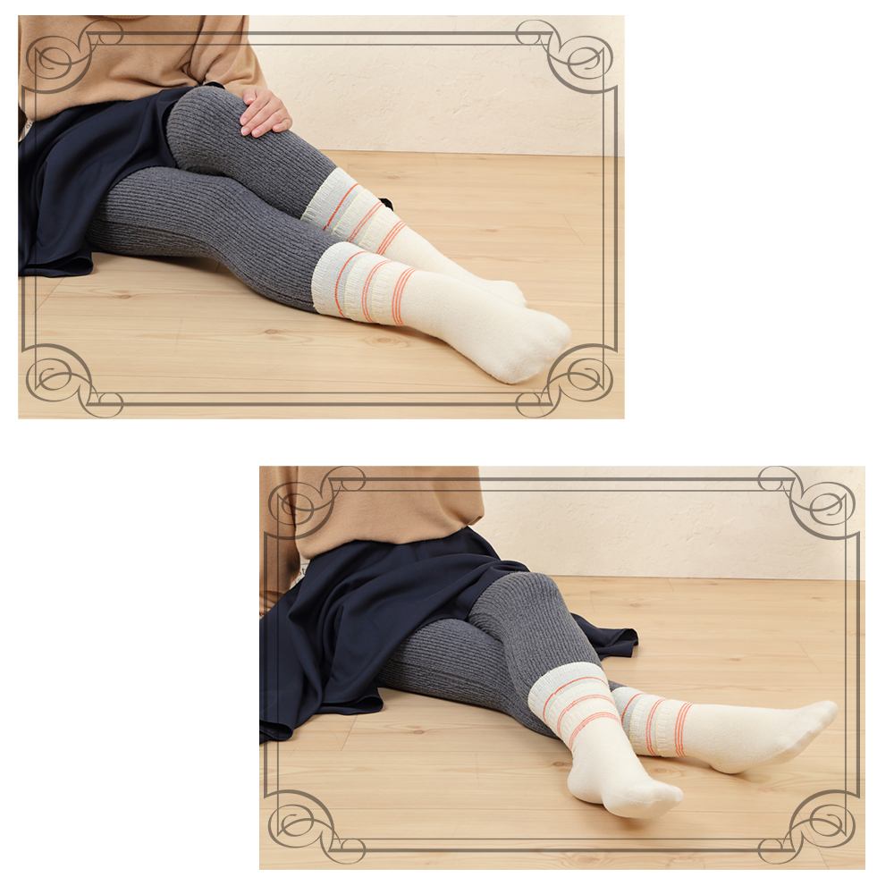 「冷えとりの里(旧商品名 冷えとりくん)4足組 シルク&コットン」 と同じように履き口の部分はやわらかいリブ編みで、2重に折り返していませんので、締め付けが気になる方にはぴったりの商品です。さらに、履き口の位置が3枚とも異なるように長さが設計されていて、同じところだけに履き口がくることはありません。
